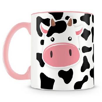 Caneca personalizada de porcelana de alto brilho interior e alça rosa com linda estampa de vaquinha.